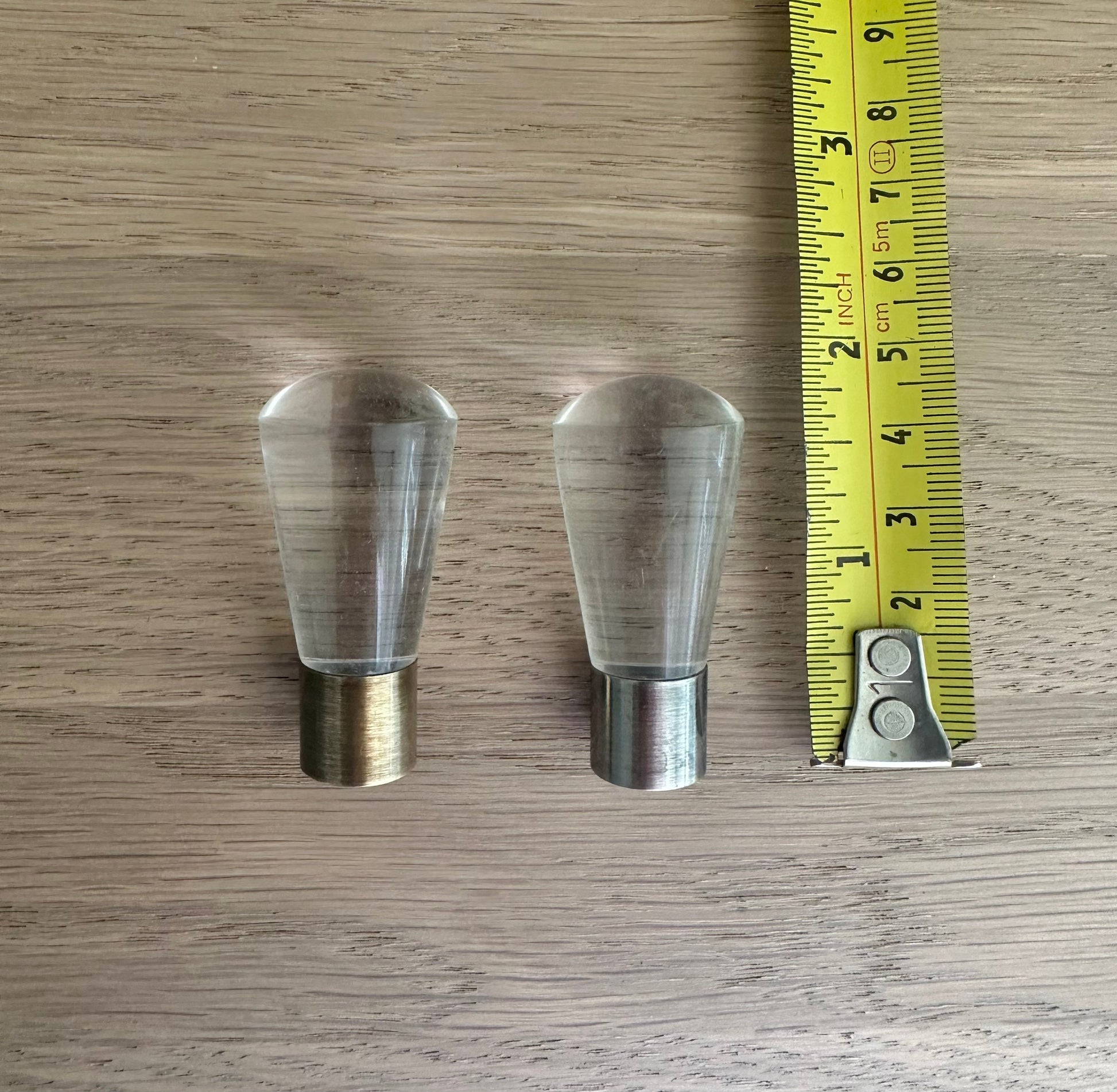 Both have a screw on clear acrylic pull.  The cord fits through a hole in the metal cap and knotted before screwing back onto acrylic pull