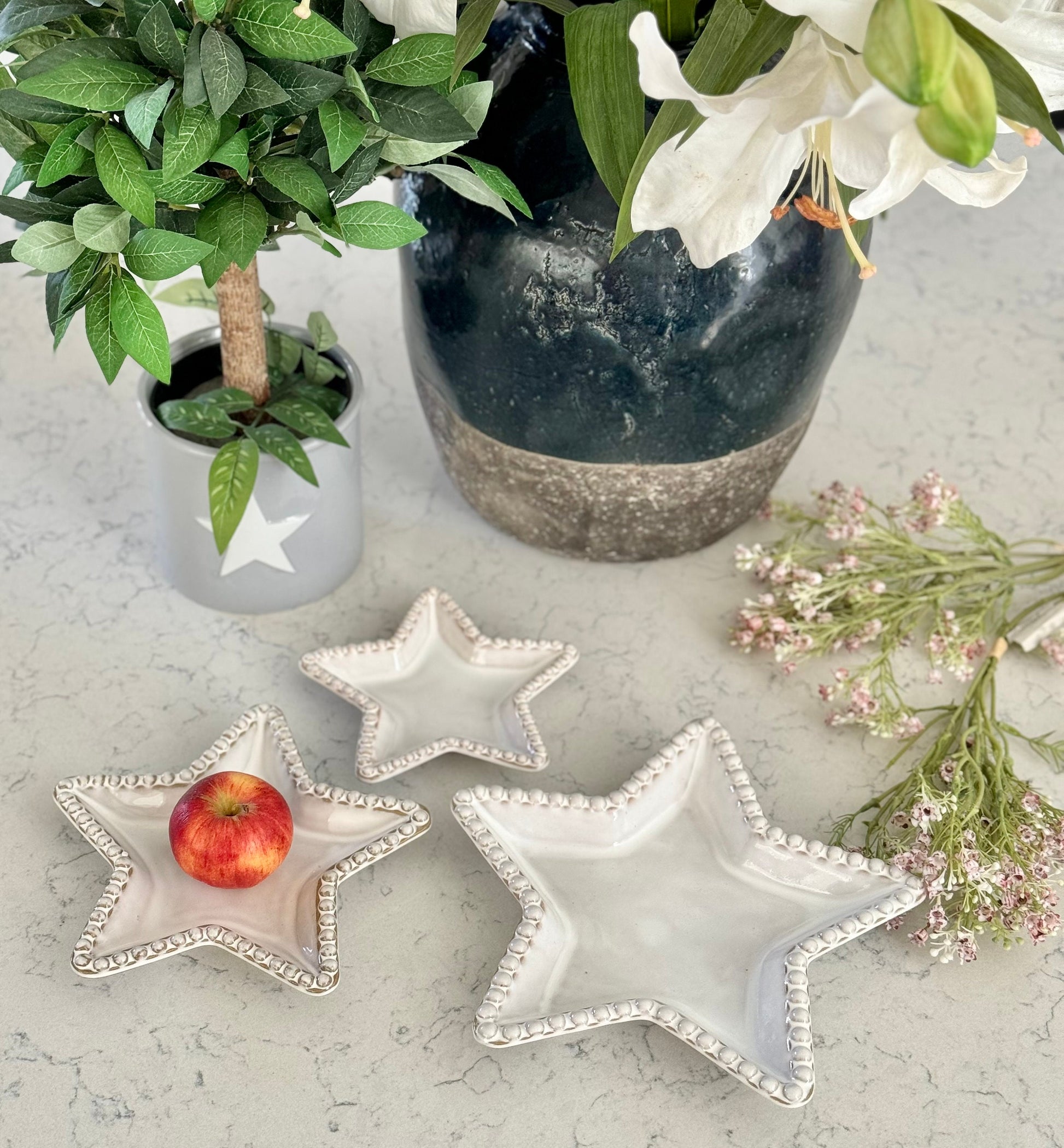 These stoneware star shaped plates are great home addition. The beaded design and semi transparent glaze adds a classic touch to your home.