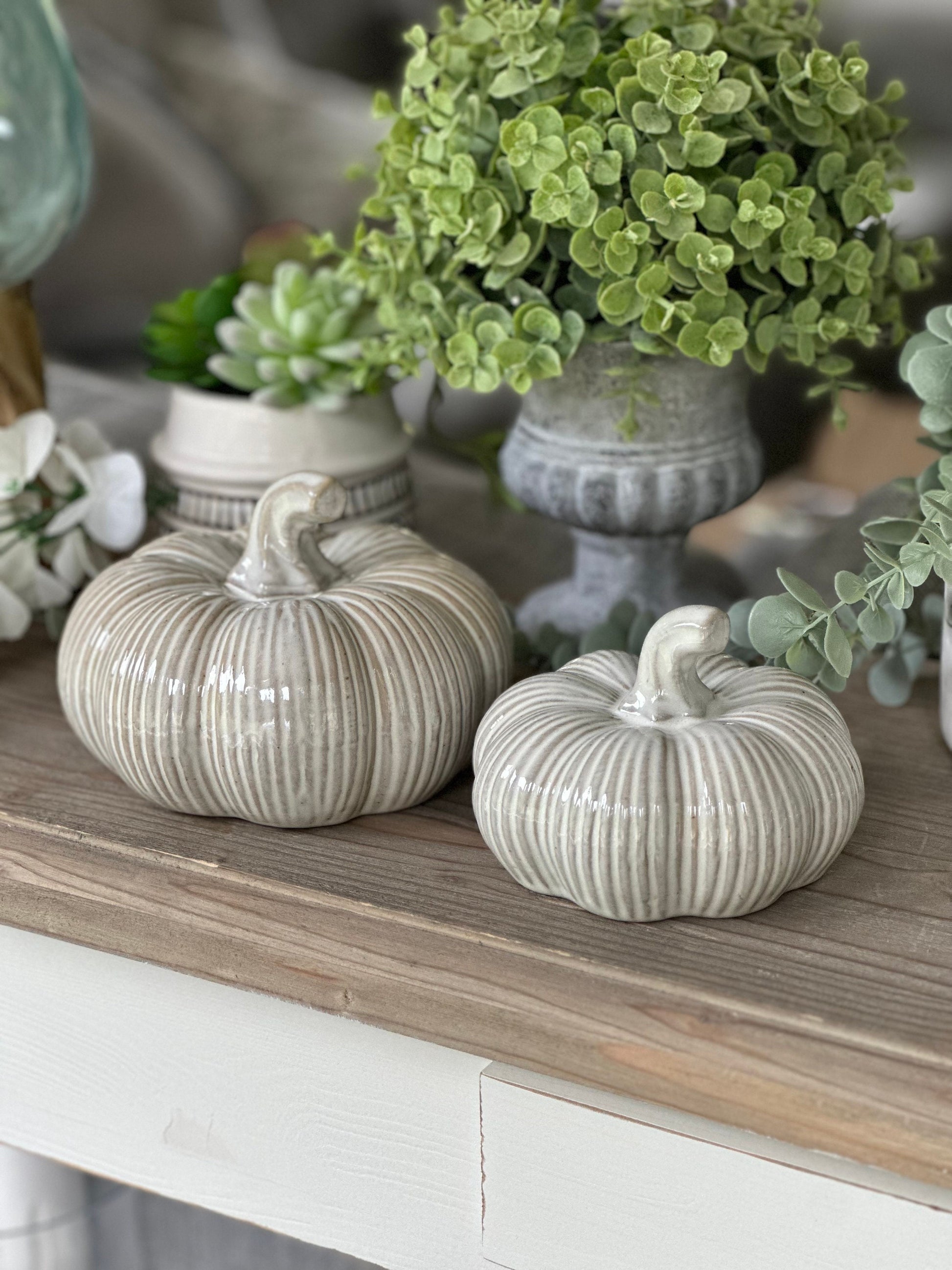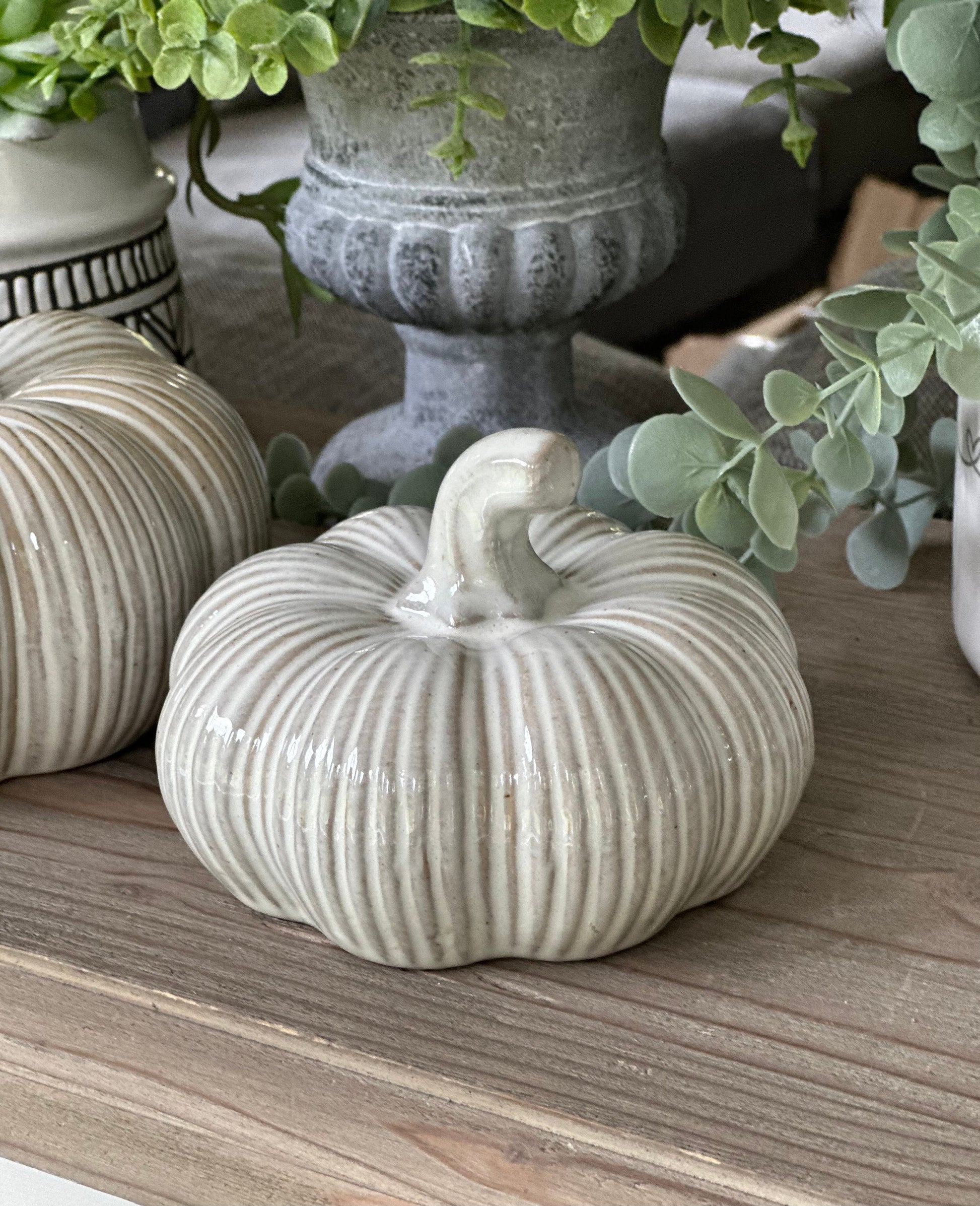 Distressed Ribbed White Ceramic Pumpkins - Choice of 2 Sizes