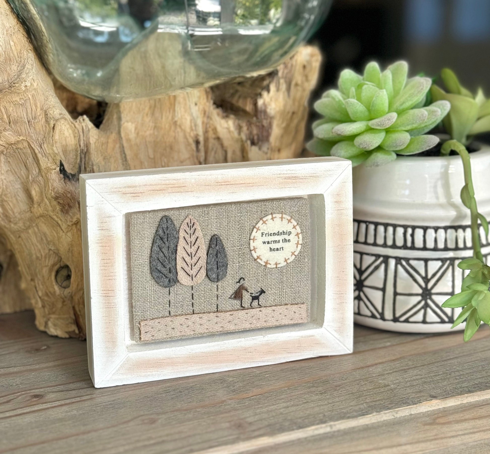 The scene features a woodland with a lady walking her dog  ‘Friendship warms the heart’, embroidered in the sun above in a vintage typewriter style font.