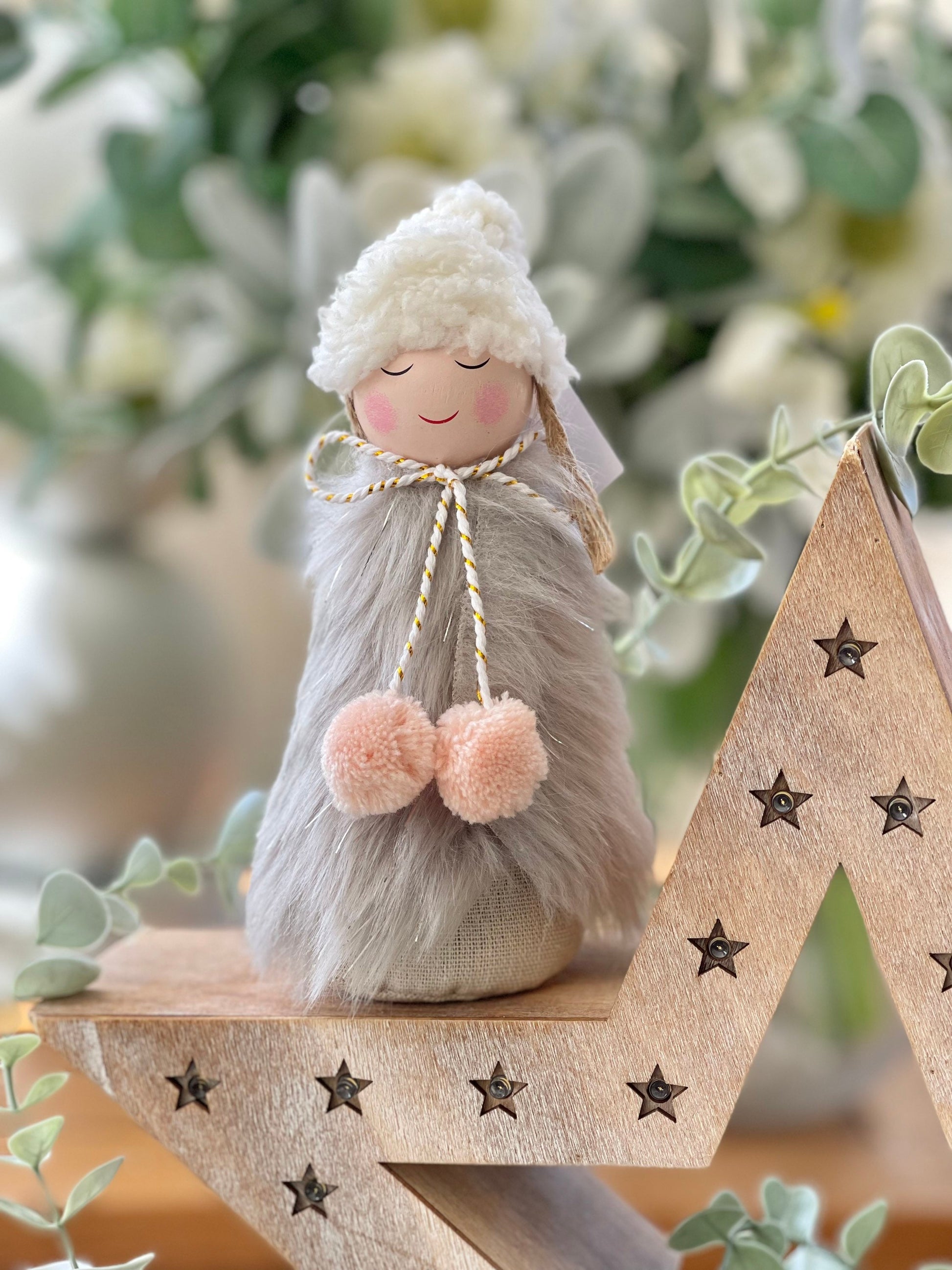 Each has a faux fur coat with fluffy hat and pompoms attached to a gold and white glitter bow, these angel decorations are unique and enchanting.