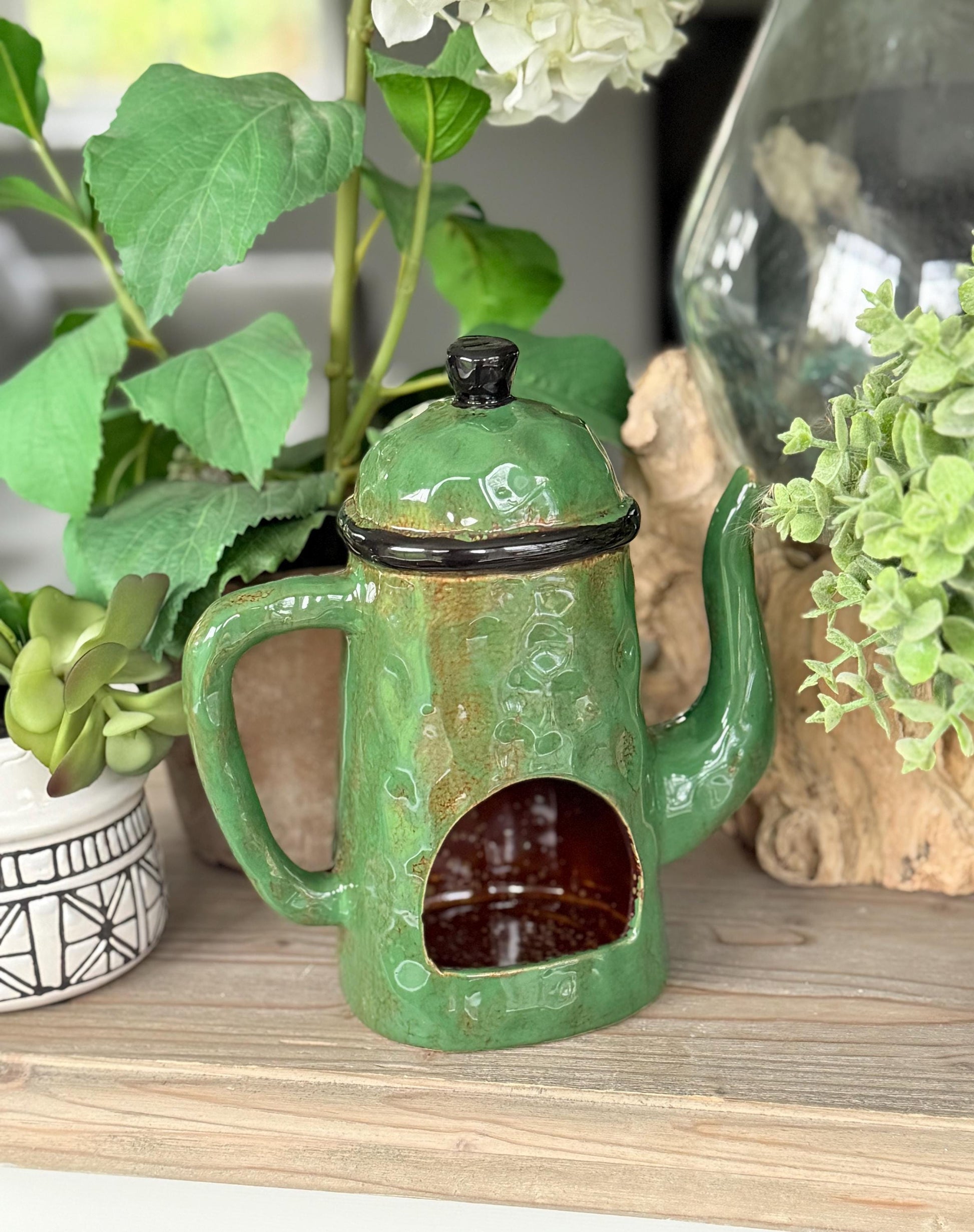 A lovely Teapot ceramic tea light holder featuring a blue front door and multi coloured bunting.