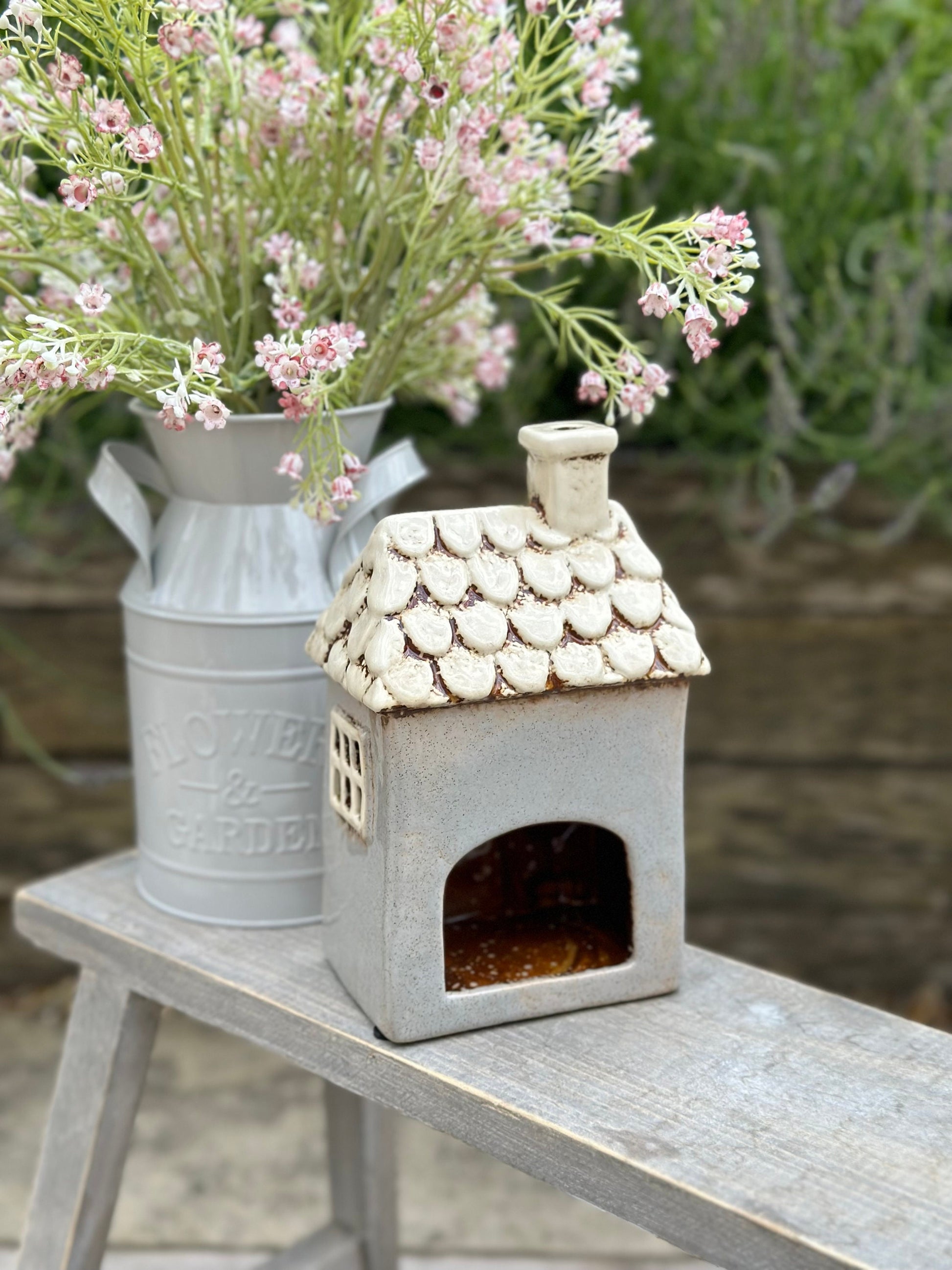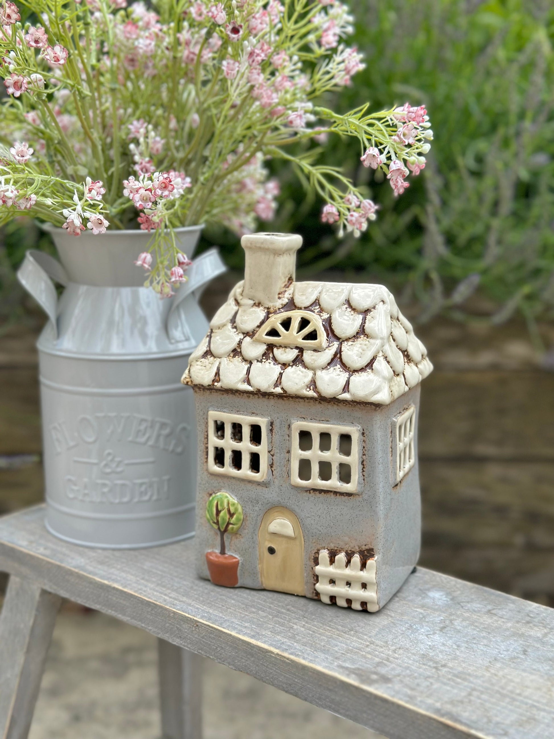 Grey with cream roof and windows with a beige front door featuring a loft window and an open chimney. This gorgeous ceramic house has topiary plant on the front door step finished with a white picket fence