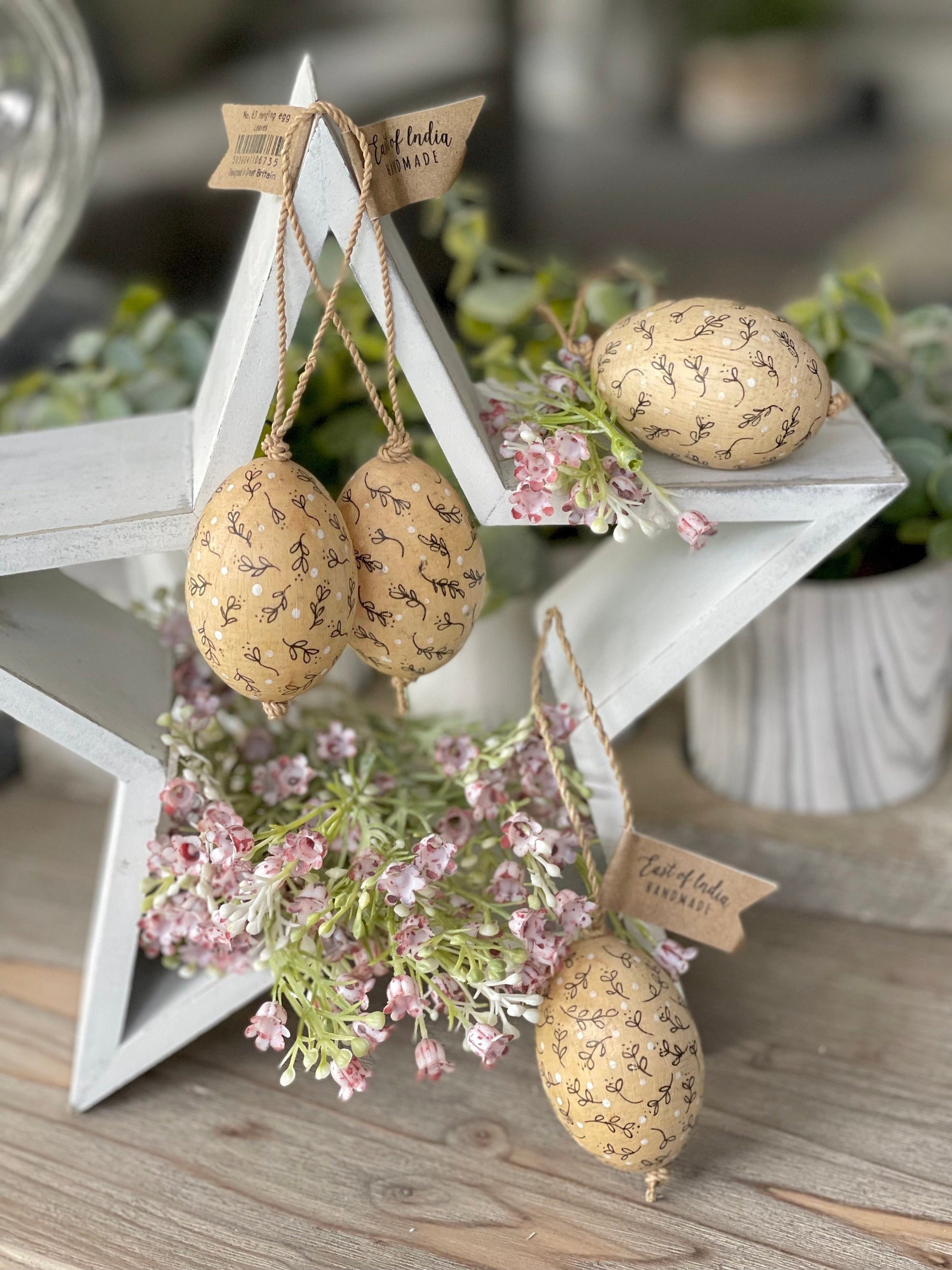 A lovely Easter hanging decoration by East Of India. Each egg has a hessian string for hanging.