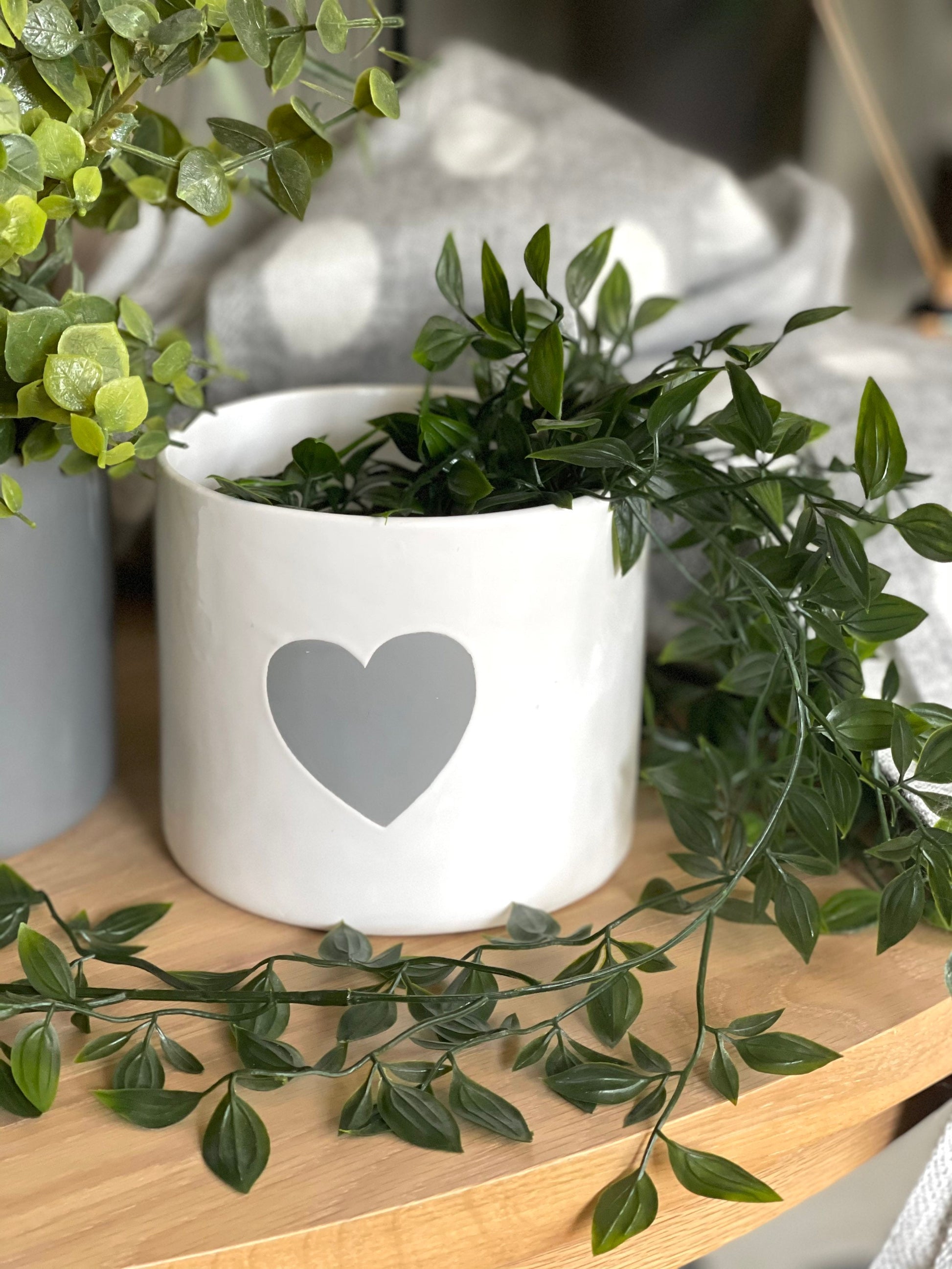 Ceramic flower pot with decorative heart detail.    Perfect for your home decor to place that perfect plant.