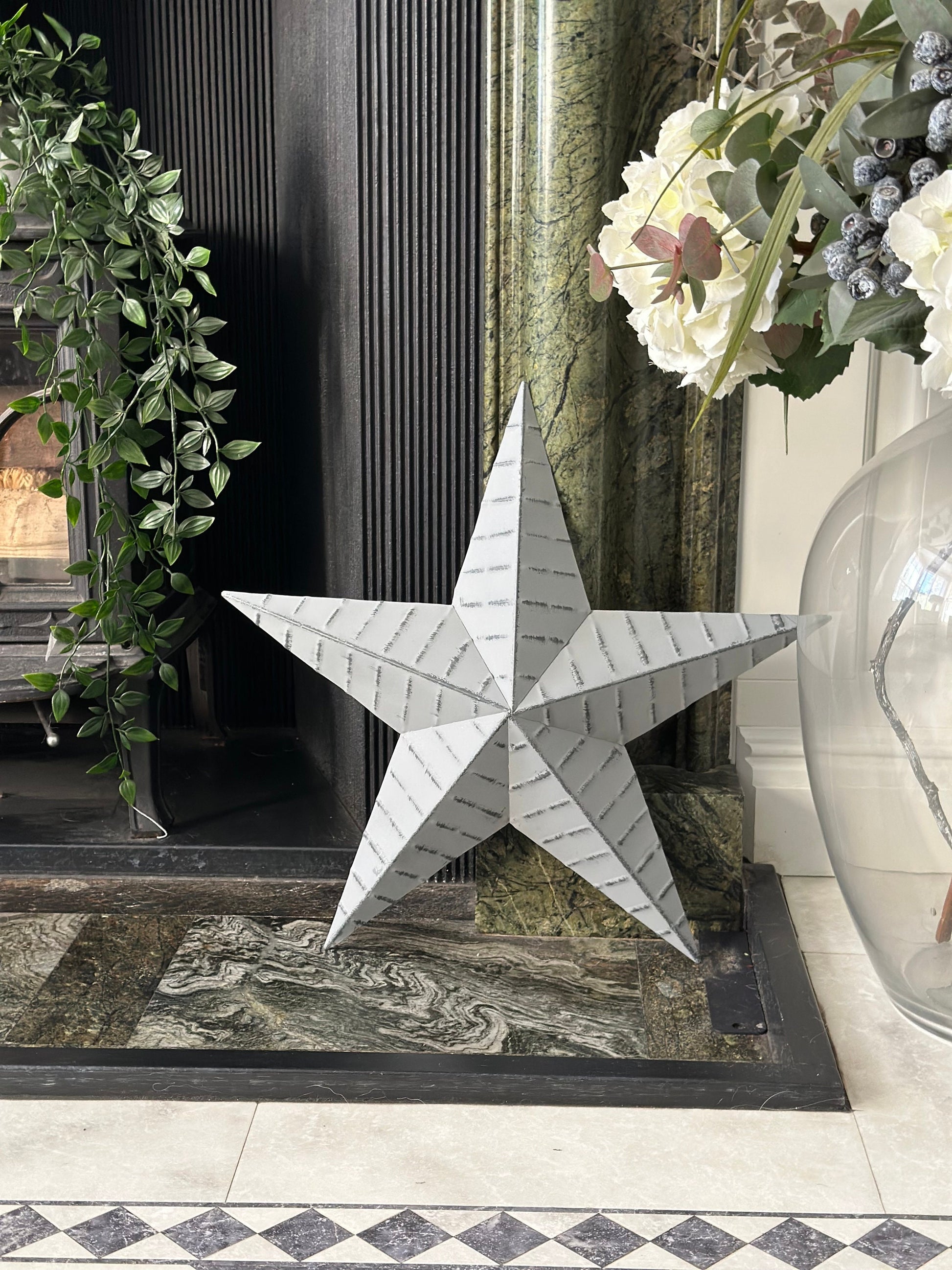 Introduce some scandi charm with this grey painted textured metal star. With hanging points for hanging on the walls or simply standing.