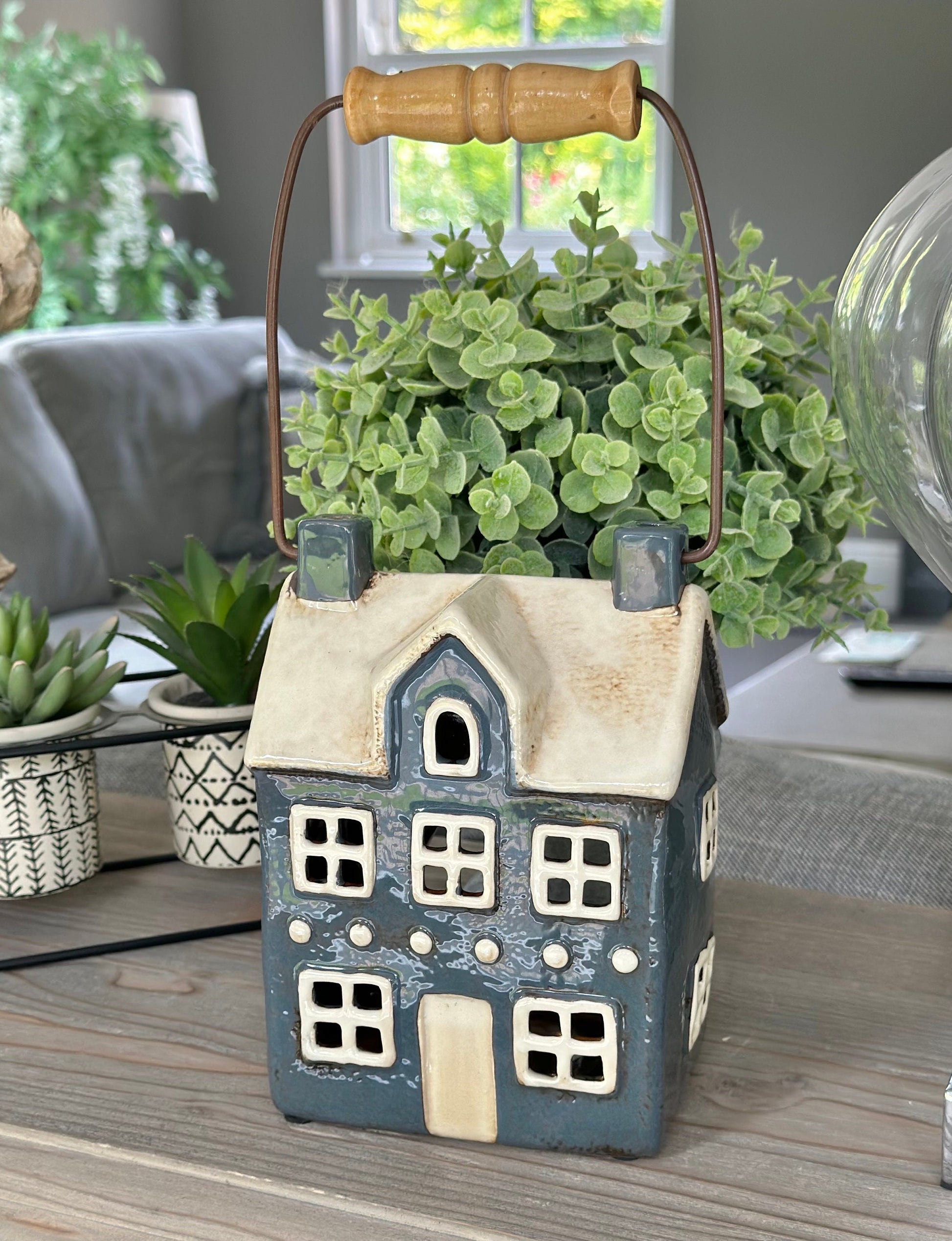 Navy Ceramic House/Cottage Candle Holder with Handle