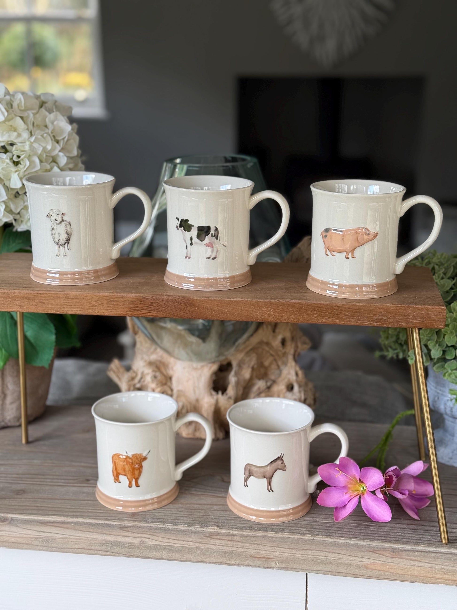 Sheep, Cow, Pig, Highland Cow and Donkey   Charming farmhouse designs featuring a light brown base and handle.  We also sell other similar designs in this embossed design.  These mugs cannot be customised