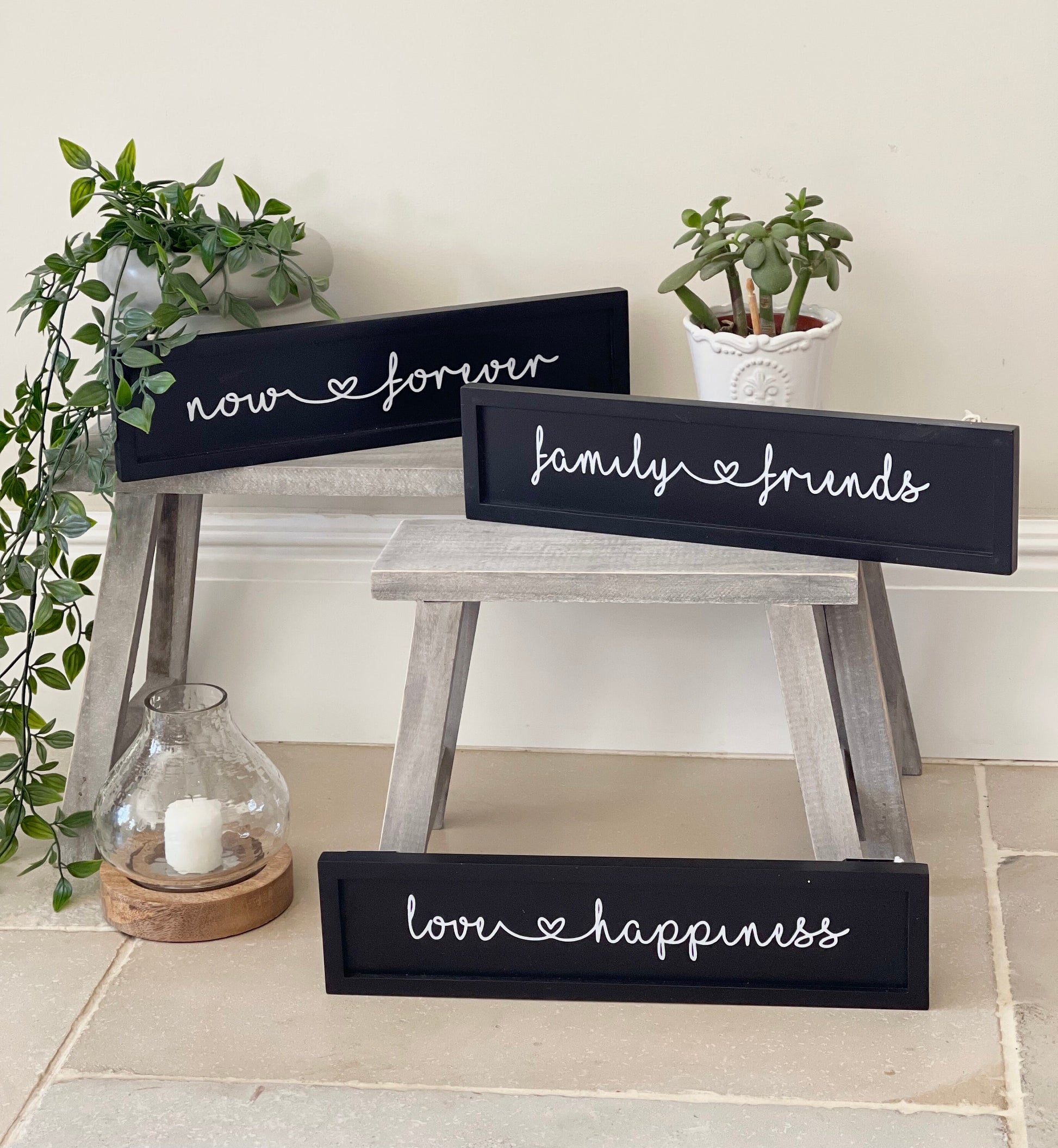 Black, framed sign with Now & Forever white text with love heart.