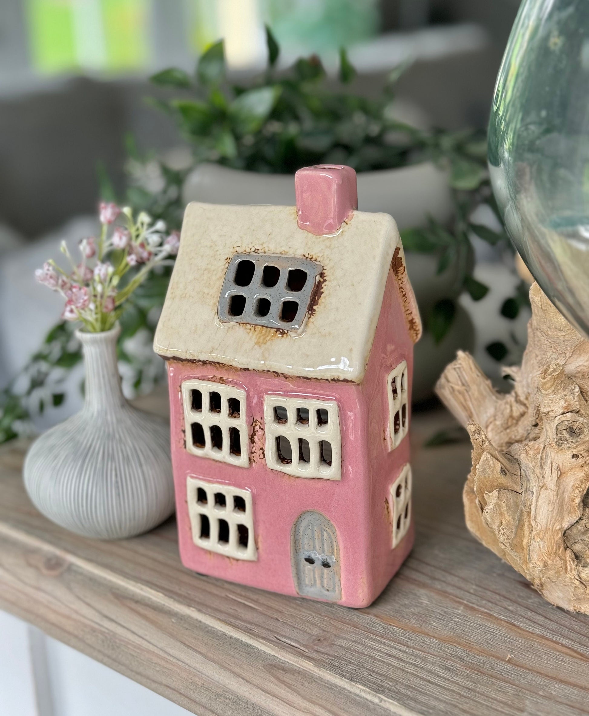 Pink with cream roof and windows with a grey front door and featuring a grey loft window and chimney.