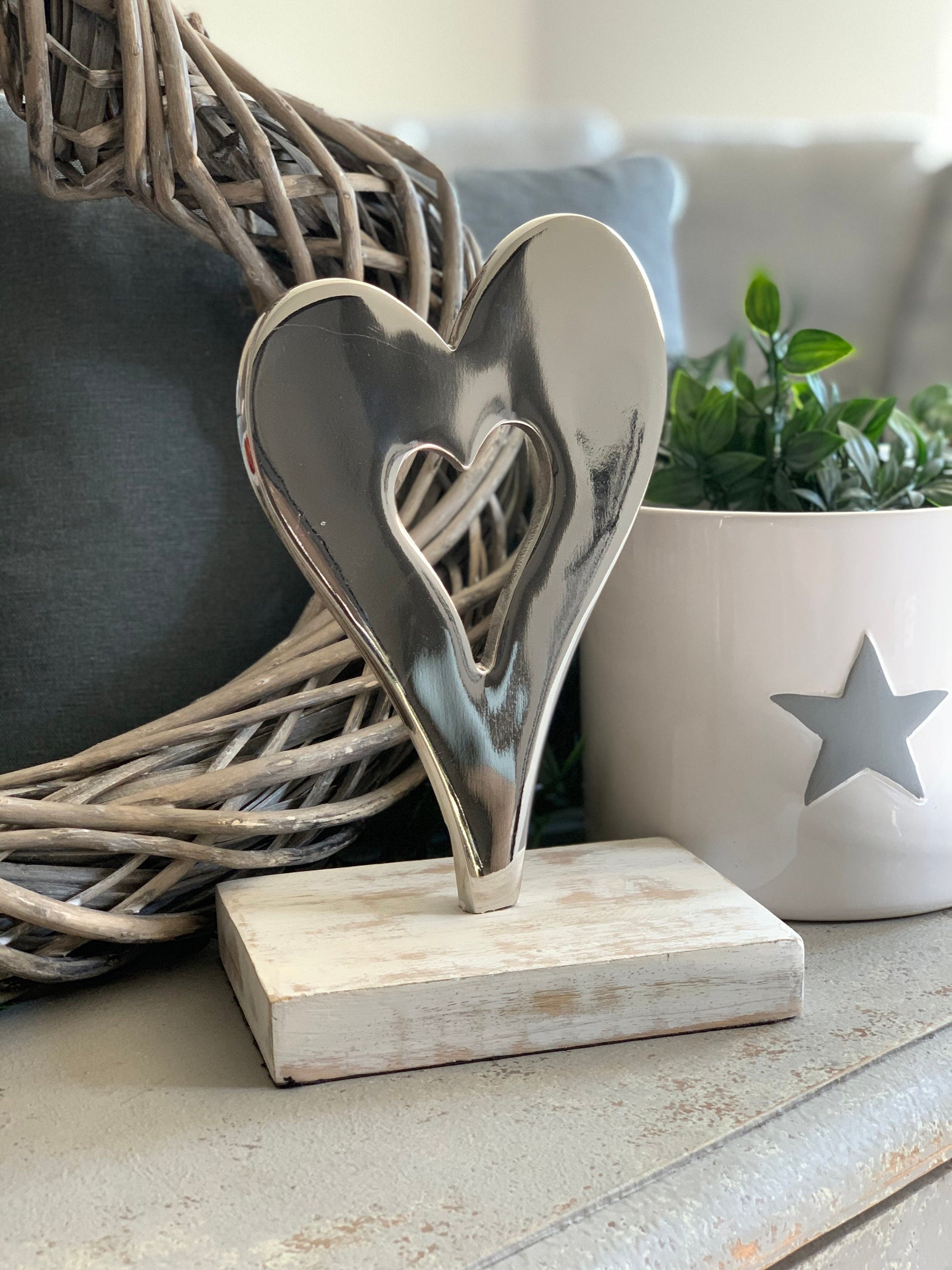 Nickel Heart on a hand finished mango wood base in a limed finish.