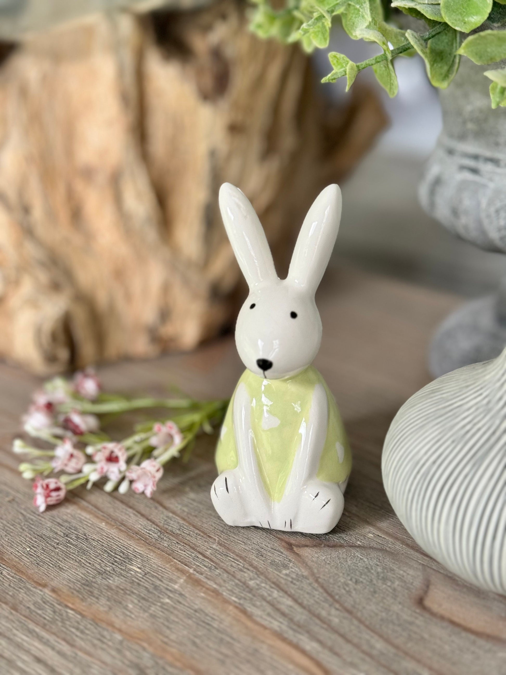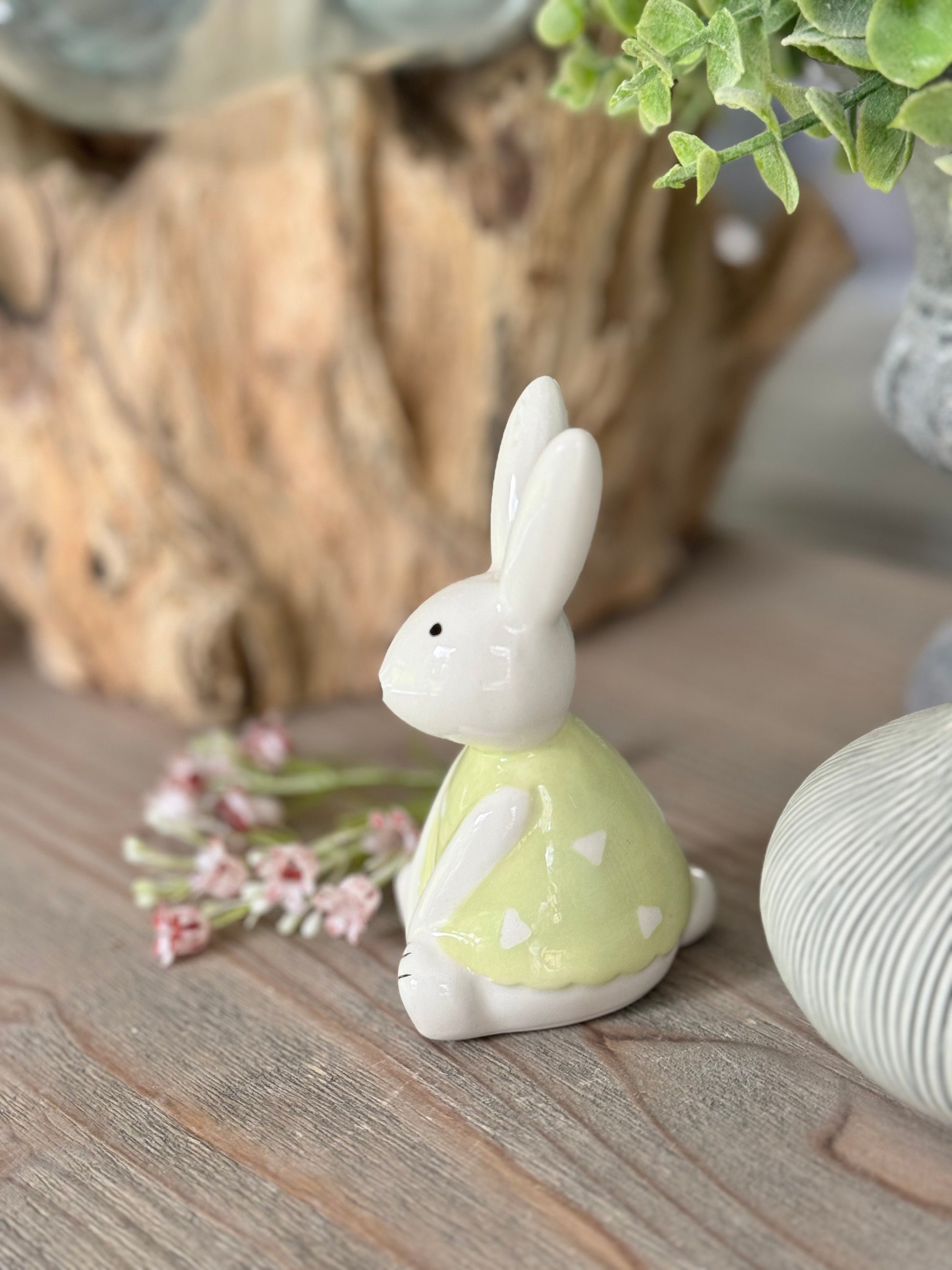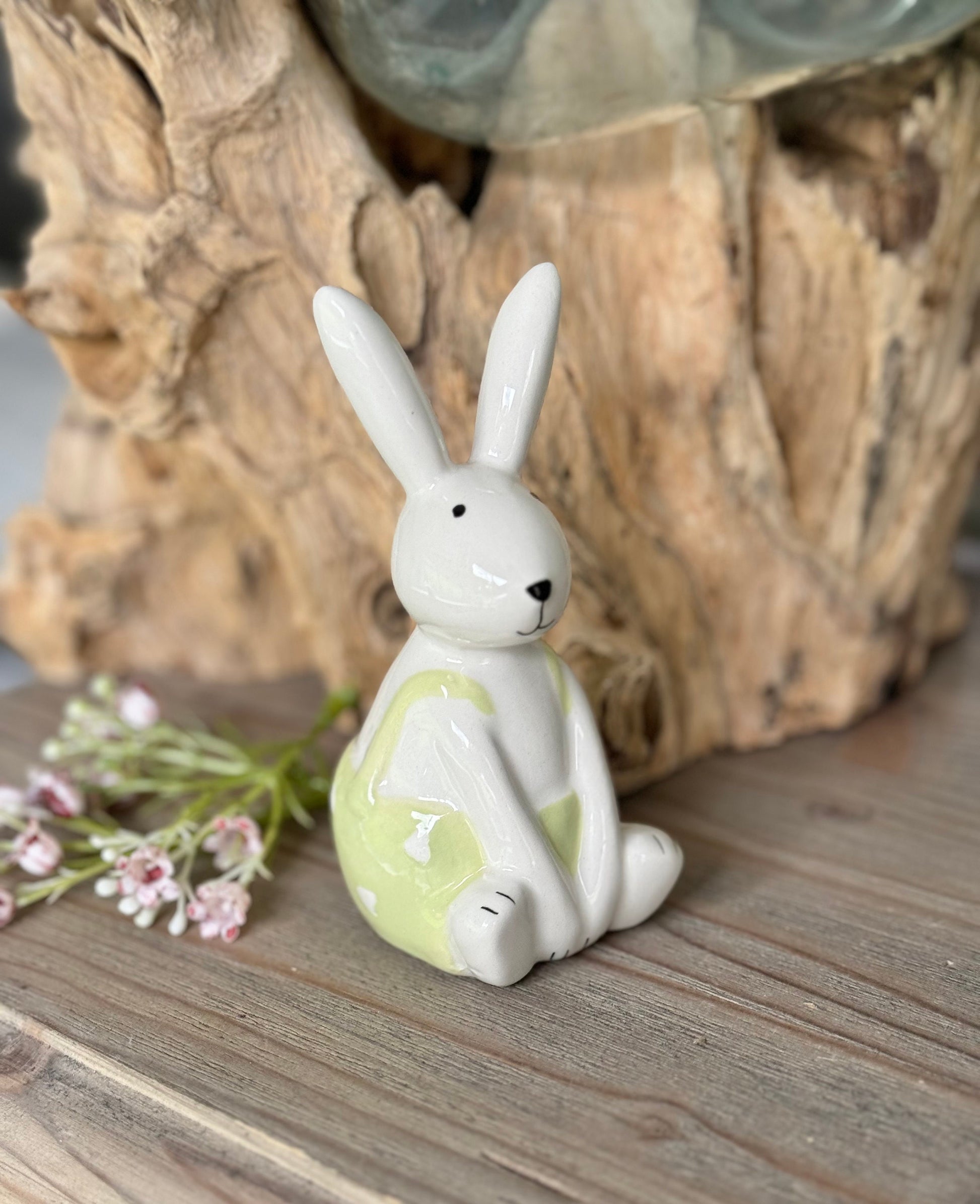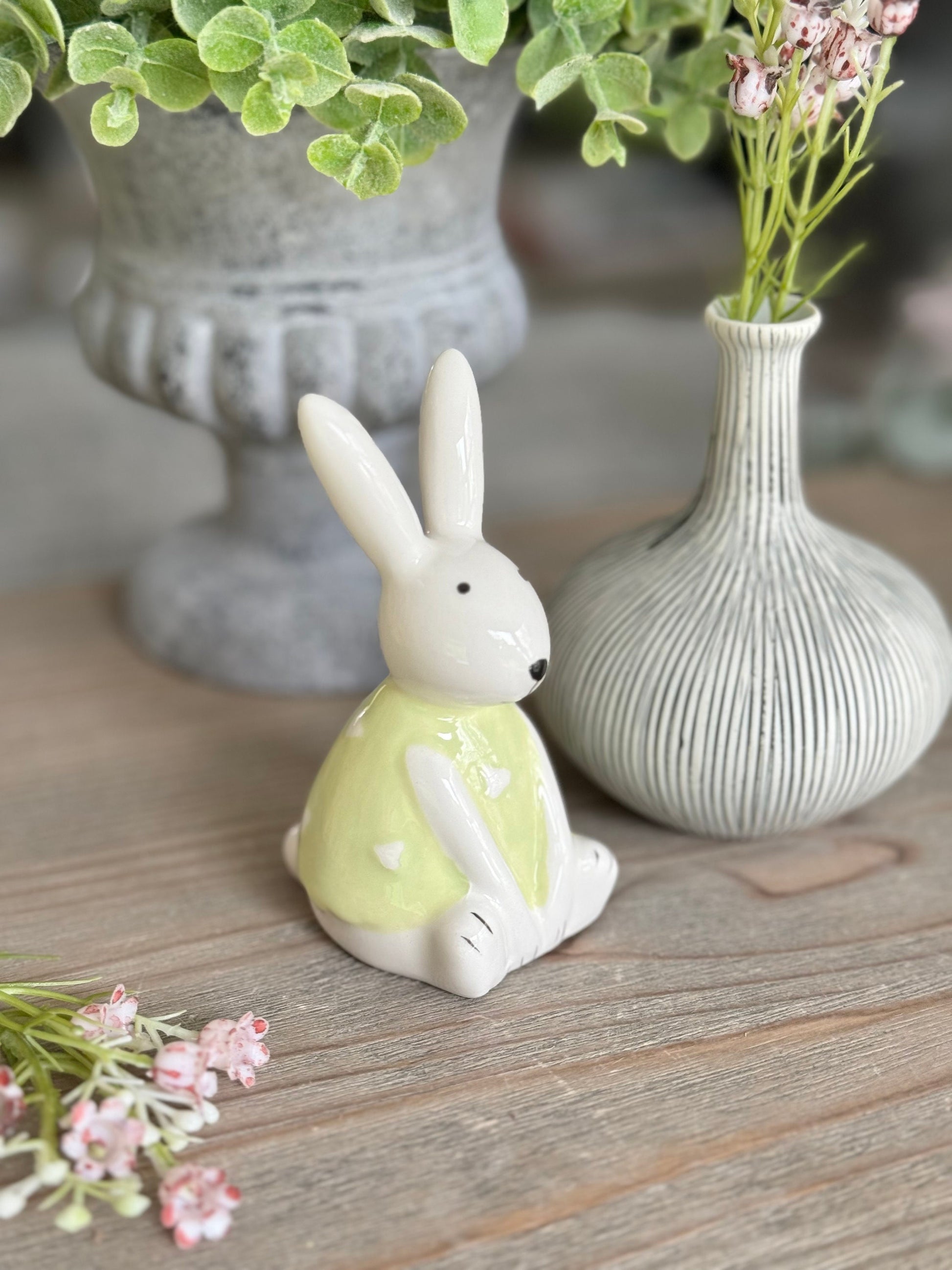 An adorable white glossy bunny ornament finished with a light green outfit with heart pattern. A simple yet sweet decorative accessory and gift item. Each sold separately