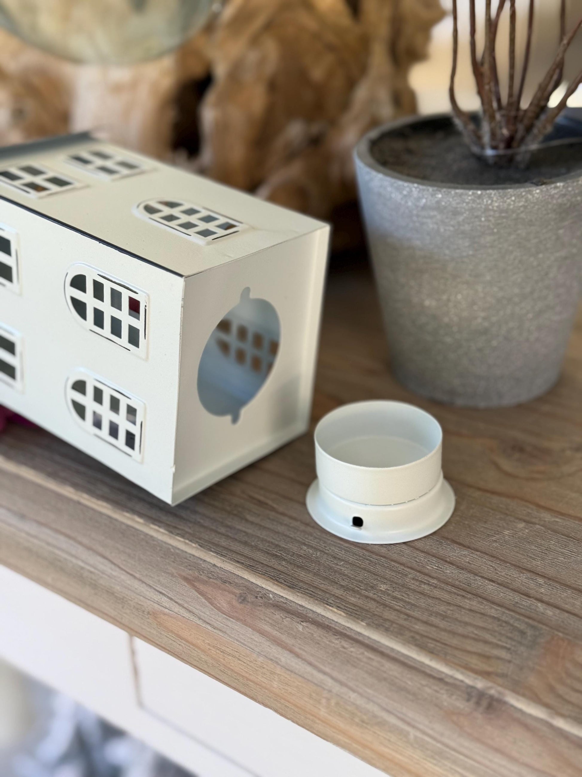 A distressed metal lantern house with a grey and white colour scheme and cut out details including a heart motif. Can be used with a tealight candle or LED tea light. (Not included)