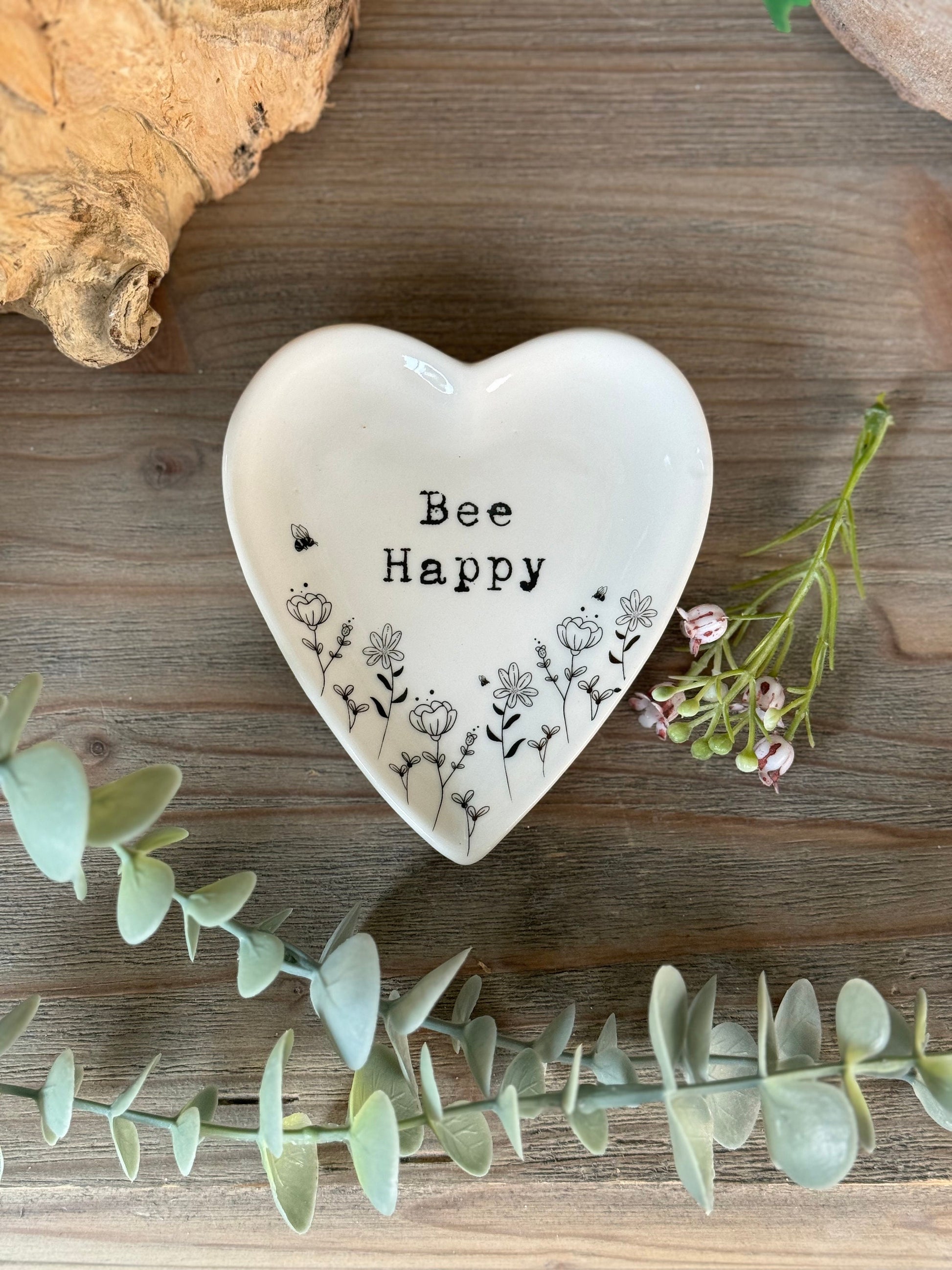A heart shaped trinket dish with a pretty floral design and Bee Happy slogan. A practical and stylish sentimental gift for friends and loved ones.