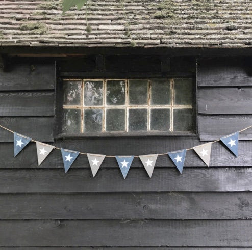 Gorgeous hanging flag wooden bunting, features 9 individual Blue and Grey flags hanging from a hessian rope with loops on either end