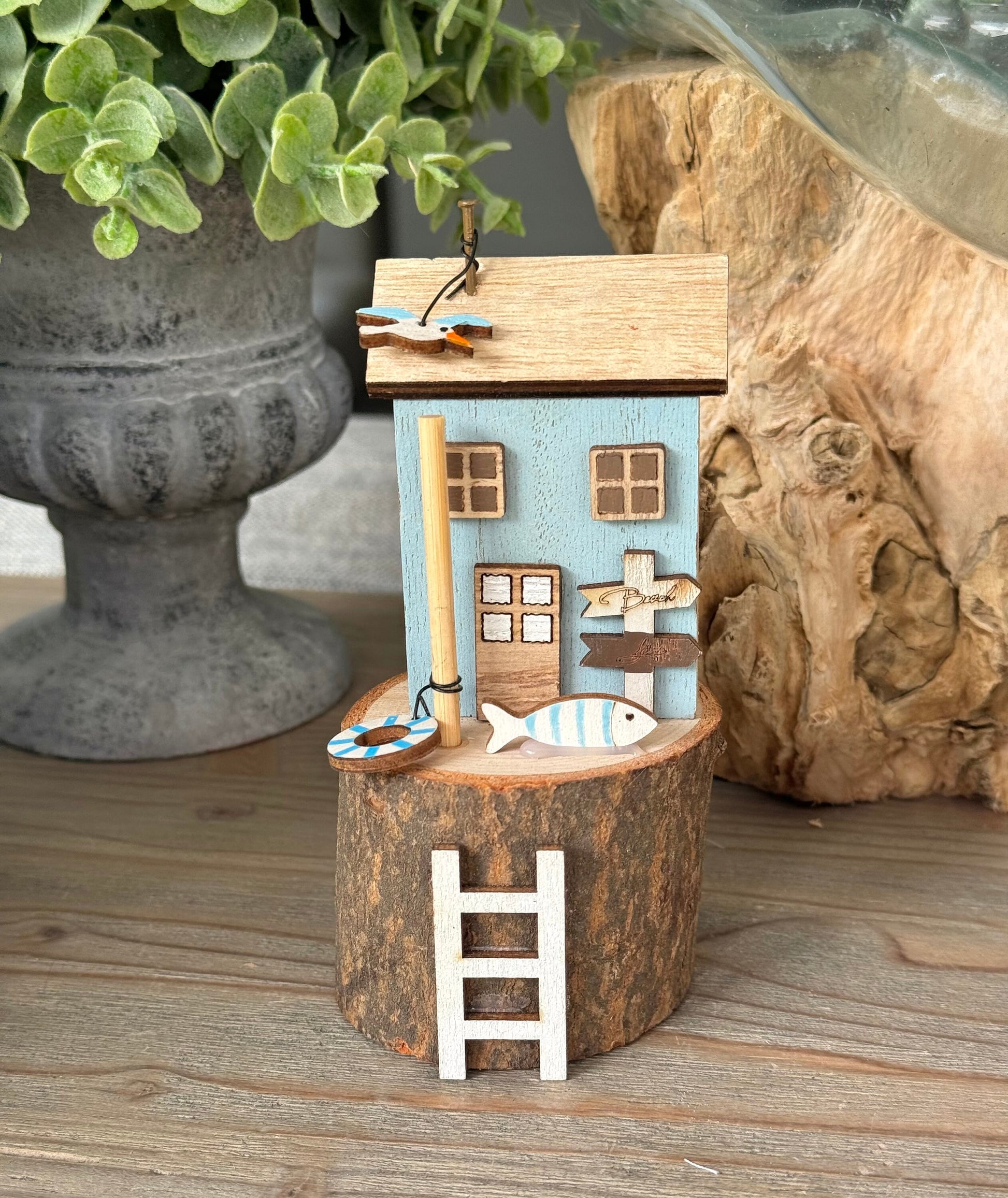 Lovely contemporary wooden seaside cottages on a wooden base each featuring seaside decorations.  Each sold Individually