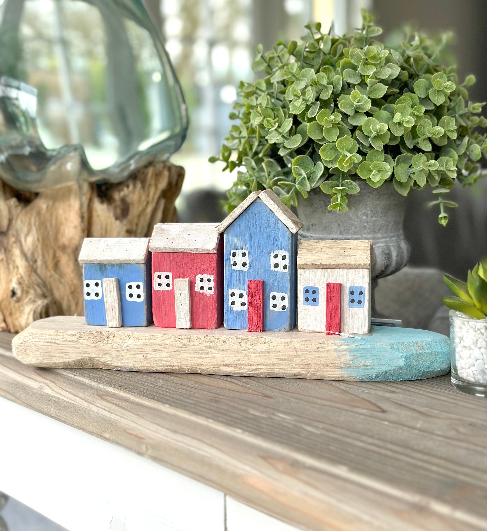 Lovely contemporary row of wooden cottages sitting on the edge of the harbour . Sweet colours of blue, red and white coastal homes.