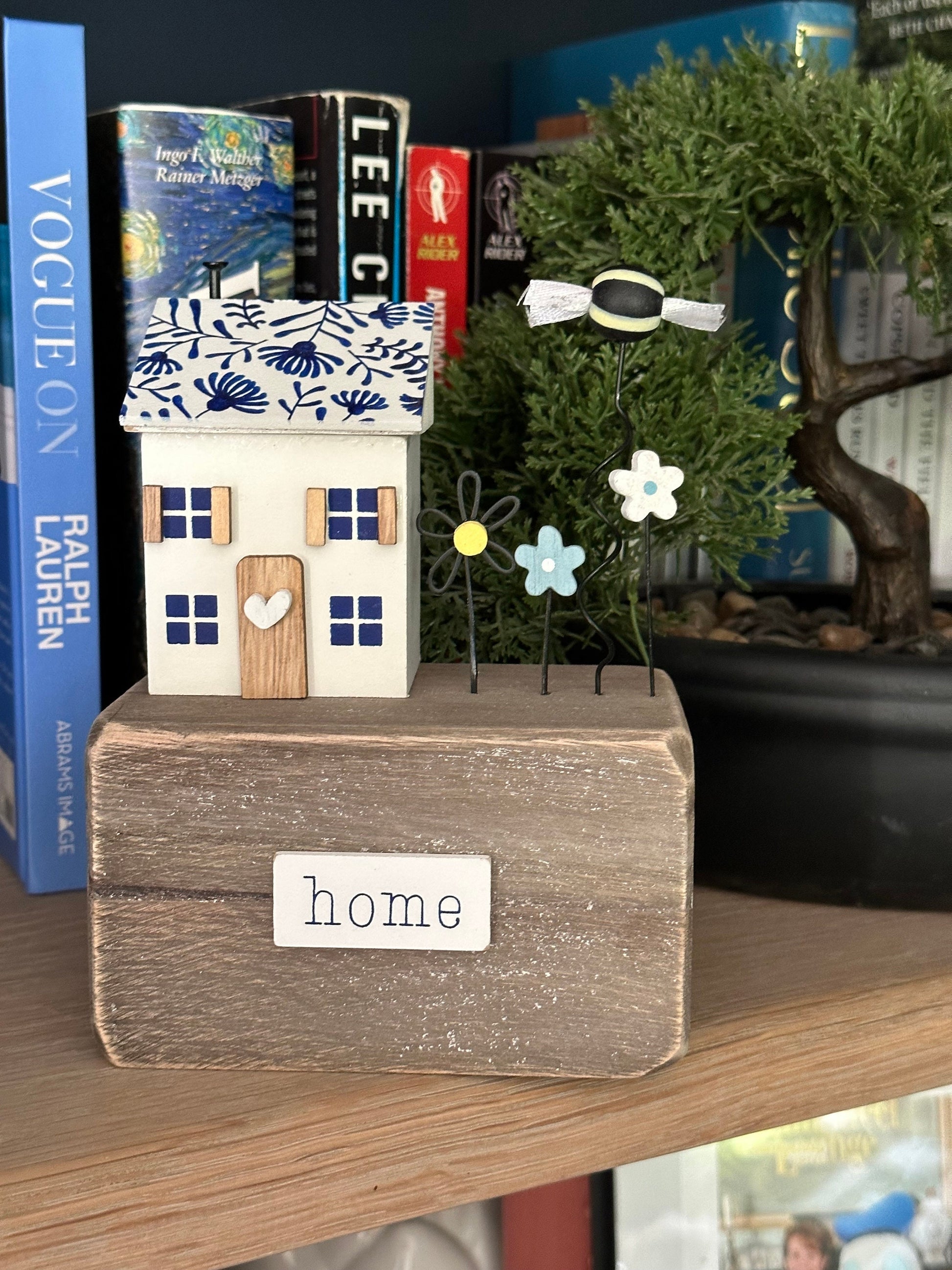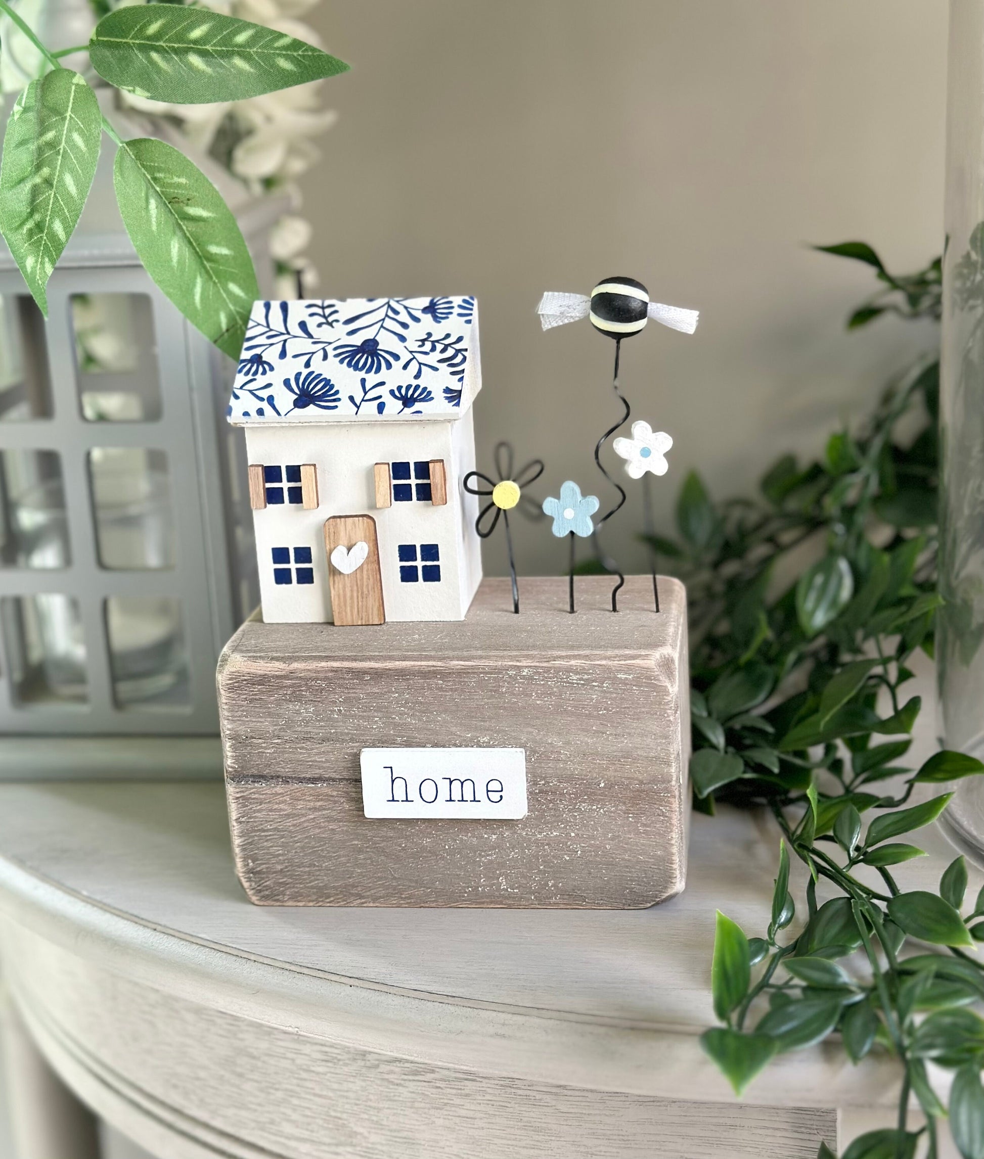 A gorgeous indigo house on a wooden block.  Perfect simple charm for creating a lovely decorative design. Features wire flowers a bumble bee and a Home sign not forgetting the ever so cute love heart on the door